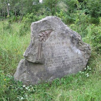 AM 1. MÄRZ 1990 / WÜTETE DER / JAHRHUNDERTSTURM / WIEBKE IM / STAATL. FORSTAMT / BEBENHAUSEN. DER STURM UND DIE / BORKENKÄFERKATASTROPE / DER TROCKENEN U. HEISSEN / FOLGEJAHRE ZERSTÖRTEN CA. 350 HA / MEIST FICHTENWÄLDER.