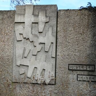 Gefallenendenkmal für die Toten und vermissten Soldaten der beiden Weltkriege, 1968/69 im Zusammenhang mit der Leichenhalle errichtet, an der nördlichen Innenwand des Friedhofs, 2,25m hoch, 8m breit, gut erhalten. Dreizehn unterschiedlich große Steinplatten in der Betonmauer eingelassen, darauf einmal ein Ornament, ein Schriftzug sowie die Namen der Verstorbenen. Davor ein gepflasterter Weg mit rundem Ende zum Aufstellen von Kränzen und zum Gedenken.