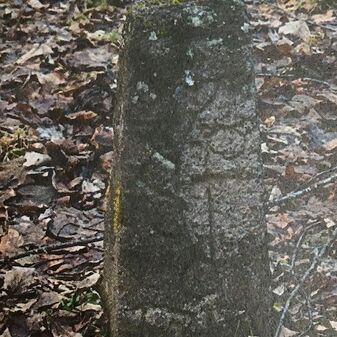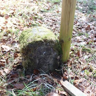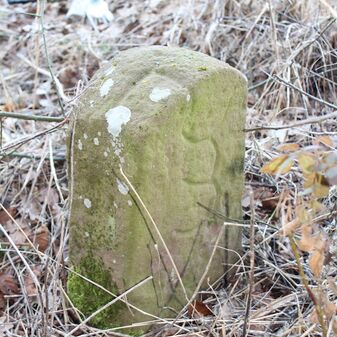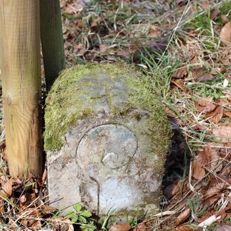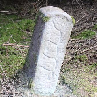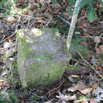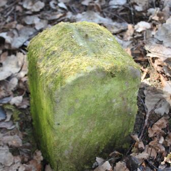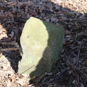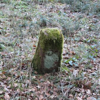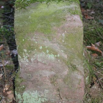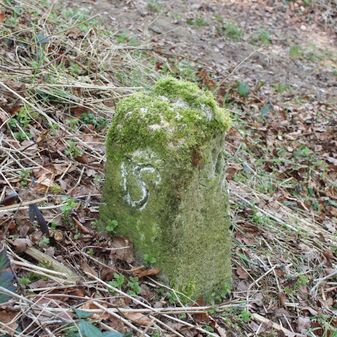 Grenzstein; Sandstein mit rechteckiger Grundform, gerader Kopf, hängt schräg, 30cm hoch, 16cm breit, 8cm tief, beschädigt. Kennzeichnung des Kopfes mit gerader Krinne sowie auf der Seite Buchstaben (G V), schwer lesbar.