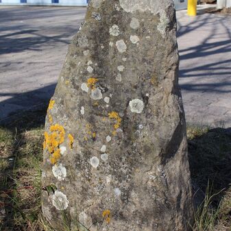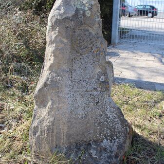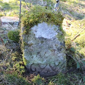Grenzstein; Sandstein mit rechteckiger Grundform, gewölbter Kopf, gerade stehend, 40cm hoch, 26cm breit, 16cm tief; beschädigt. Kennzeichnung des Kopfes nicht zu erkennen; auf der Seite Buchstaben (GVW).