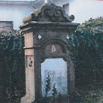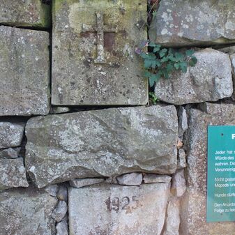 Friedhofsmauer von 1925 mit einem Gedenkstein mit Kreuz und darunter ein Stein mit der Jahreszahl „1925“, Höhe des Gedenksteins 55cm, Breite 47cm, Verwitterungsspuren.