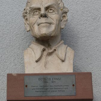 Büste von Gottlob Ernst (Rektor, Verfasser des Heimatbuchs und Ehrenbürger von Deckenpfronn) aus dem Jahr 1994, anlässlich seines 100. Geburtstags. Entwurf wohl von Otto Krause-Bächer, Künstler aus Tübingen; rötlicher Ton / Kunststein, 50cm hoch, 35cm tief und breit, auf einer rötlichen Steinplatte mit Metallplatte an der Fassade der Schule, geringe Beschädigungen. Die Grundschule ist nach Gottlob Ernst benannt.