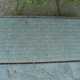 Gefallenendenkmal für die gefallenen und vermissten Soldaten des Zweiten Weltkriegs; bestehend aus fünf Gedenktafeln mit den Namen und Lebensdaten sowie einem Relief einer trauernden Frau mit Kreuz. Kalksteinplatten, 90cm hoch, 80cm breit, 3cm tief, an der Mauer vor der Nikolauskirche angebracht, mit geringen Beschädigungen. Gemäß den Erfassern sind auch die Opfer des Fliegerbombenangriffs vom 21.04.1945 aufgelistet.