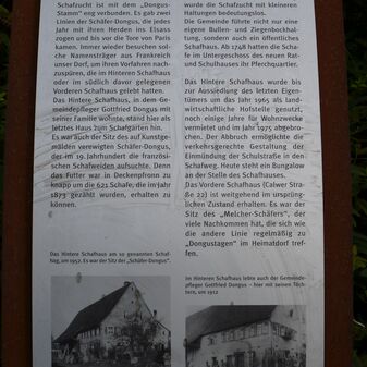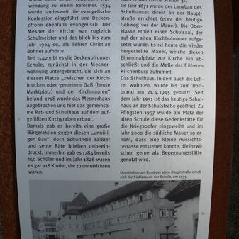 Bauinschrift mit Jahreszahl, Initialen und Handwerkersymbol an erhaltenem Türsturz von 1898. Das Gebäude war durch den Fliegerbombenangriff im Jahr 1945 zerstört worden, doch Türlaibung und Sturz erinnern noch an die verlorene Bausubstanz. Ca. 2m hoch, 1,30m breit und 30cm tief, Sandstein, befriedigend erhalten. Eine Metalltafel mit erläuterndem Text steht dabei.