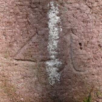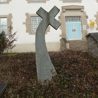 Skulptur „gebogenes Kreuz“ aus Granit von 1994, Entwurf von Paul Dittus, Bildhauer aus Herrenberg, anlässlich des 50. Jahrestags der Zerstörung von Deckenpfronn 1995 aufgestellt. 180cm hoch, 60cm breit, 40cm tief, gut erhalten. Steinkreuz, das im oberen Bereich nach rechts gebogen ist. Metallplatte mit Inschrift.