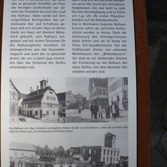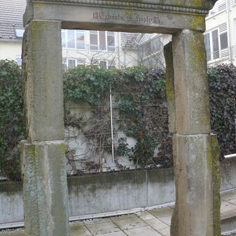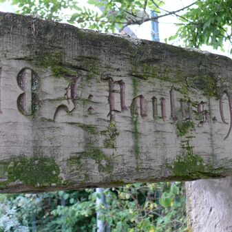 Bauinschrift mit Jahreszahl, Initialen und Perlstabdekor an erhaltenem Türsturz von 1884. Das Gebäude war durch den Fliegerbombenangriff im Jahr 1945 zerstört worden, doch Türlaibung und Sturz erinnern noch an die verlorene Bausubstanz. Ca. 2m hoch, 1,30m breit und 30cm tief, Sandstein, befriedigend erhalten.