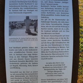 Gedenkkreuz mit Inschrift, aus grob behauenem Stein auf niedrigem Sockel, anlässlich des 750. Todestags von Graf Burkhard V. von Hohenberg, 2003 aufgestellt auf Initiative von Gerhard Raff, Historiker aus Stuttgart. Der Graf wurde am 14.07.1253 - vermutlich an dieser Stelle - vom Blitz getroffen und verstarb in seinem Schloss in Wildberg. 240m hoch, 100cm breit, 28cm tief, gut erhalten. Daneben eine Tafel mit näheren Informationen und eine Panoramatafel.