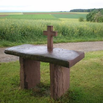Altar aus drei Bundsandsteinplatten (2 senkrecht, 1 waagrecht) und einem Kreuz nahe der Schillerlinde. Errichtet im Jahr 2012 für Gottesdienste im Freien, ""Gottestdienst im Grünen"". Entwurf Thomas Dittus, Bildhauer aus Herrenberg. 1,5m hoch, 1,6m breite, 75cm tiefe, rechteckige Buntsandsteinplatten, gut erhalten.