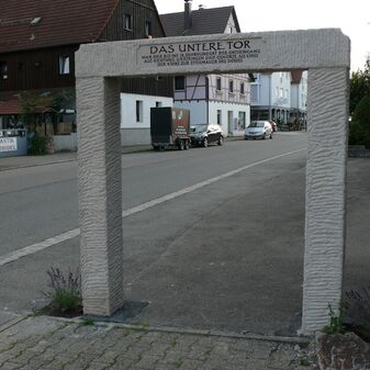 „Unteres Tor“, Nachbildung eines von ehemals vier Toren in der Ettermauer von 2013. Zwei senkrechte Stelen aus Muschelkalk als Laibung, darauf ein waagrechter Steinbalken mit Inschriften auf beiden Seiten. 2,2m hoch, 2,1m breit, 25cm tief, gut erhalten. Künstler: Thomas Dittus, Bildhauer aus Herrenberg.