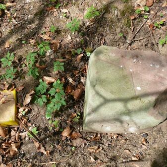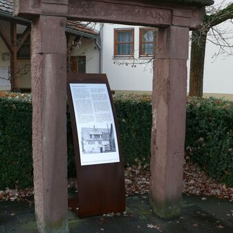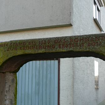 Bauinschrift mit Jahreszahl und Initialen an erhaltenem Türsturz von 1892. Das Gebäude war durch den Fliegerbombenangriff im Jahr 1945 zerstört worden, doch Türlaibung und Sturz erinnern noch an die verlorene Bausubstanz. Ca. 2m hoch, 1,30m breit und 30cm tief, Sandstein, befriedigend erhalten. Eine weitere Türlaibung steht daneben.