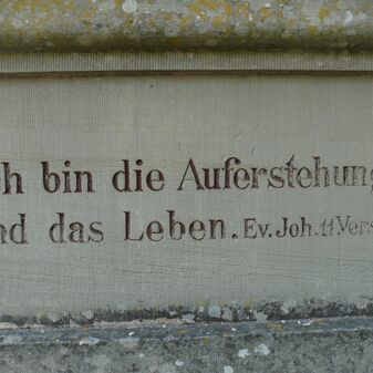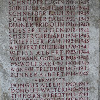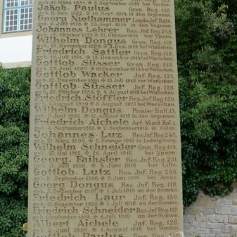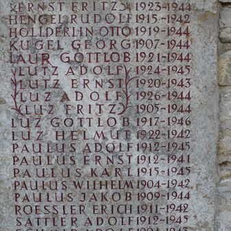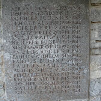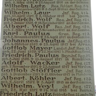 Jhren im Weltkrieg 1914-18 / gefallenen Söhnen gewidmet von / der dankbaren Heimatgemeinde. // Jch bin die Auferstehung / und das Leben. Ev. Joh.11.Vers 25. // Jhr war’t treu bis in den Tod / Solche Treu‘ bleibt unvergessen. / Unser Schmerz ist unermessen. / Doch ihr kamt zur Ruh in Gott. / Weil ihr treu war’t bis in Tod. // Matt. Kübler / Stuttgart // Fürs Vaterland starben / Wilhelm Paulus [...]