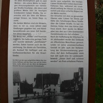 Mahlstein aus rötlichem Stein, steht in der Rinne eines kreisrunden Steinblocks, der auf einem quadratischen Steinpodest ruht. Der Mahlstein ist mit einem Metallarm befestigt; ca. beginnendes 20. Jahrhundert. Er wurde 1982 in dieser Form errichtet, bearbeitet von Gottlob Scheurenbrand. Mahlsteine wurden von Pferden gezogen, um Früchte zu mahlen und daraus Saft und Most zu gewinnen. Früherer Standort: Calwer Straße 12; Durchmesser 1,80m, Höhe 1,30 m; befriedigend erhalten.