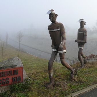„Sportler“, Freiplastik aus Altmetall von Willi Lutz, Künstler aus Deckenpfronn, von 2007. Dargestellt sind zwei Sportler mit Schildmützen, die entlang der Straße zum Sportplatz laufen und ein Wegweiser nach Berlin. 1,9m hoch, 1,3m breit, 50cm tief, gut erhalten.