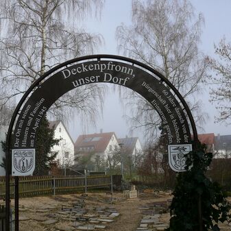 Gedenkstätte bestehend aus kleinen Tafeln und Modellen aus Ton, die den ursprünglichen Ortsplan von Deckenpfronn vor der Zerstörung 1945 wiedergeben. Entwurf Otto Krause-Bächer, Künstler aus Tübingen; Zeichnung von Fabian Beck, von 2005, anlässlich des 60. Jahrestags der Zerstörung. 5cm hoch, 9m breit, 20mlang, gut erhalten. Dunkle Platten stehen für die zerstörten Gebäude, helle Platten für die erhaltenen Gebäude, kleine Schilder kennzeichnen die Straßen. Metallbogen als Eingang und Tafel mit Erklärungen.
