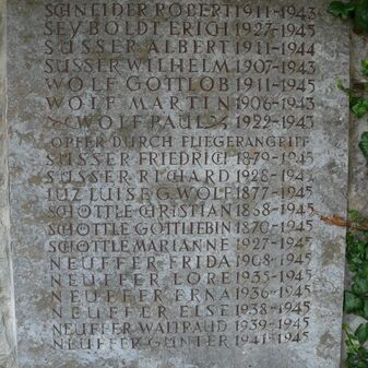 Gedenktafel von 1977 aus zwei Bronzeplatten mit Relief der brennenden Häuser und Inschrift auf schmalem Betonbodensockel, erinnert an die Opfer des Fliegerbombenangriffs am 21.04.1945. 2cm hoch, 110cm breit, 230cm tief, gut erhalten. Laut den Erfassern sind unter der Platte die Gebeine der Opfer beigesetzt. Am Totensonntag 1977 von der Gemeinde gestiftet.