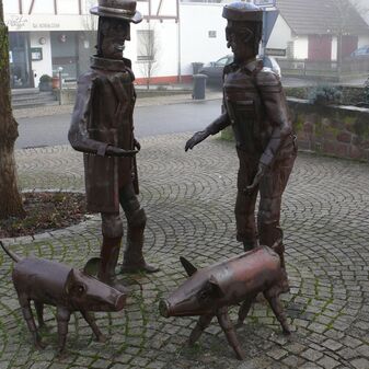 „Viehhändler“, Freiplastik aus Altmetall von Willi Lutz, Künstler aus Deckenpfronn, von 2009. Dargestellt sind ein Händler, ein Bauer, zwei Schweine und in etwas Abstand ein angekettetes Kalb. Viehhändler und Bauer besiegeln einen Kaufhandel mit einem Handschlag. 1,9m hoch, 1,3m breit, 50cm tief, gut erhalten.
