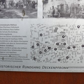 18 Gedenktafeln entlang eines historischen Rundgangs im Ortskern von Deckenpfronn, die an die 1945 bei einem Fliegerbombenangriff zerstörten Häusern erinnern. Rechteckige Metall/Aluplatten mit Texten, Bildern und einem Stadtplan. 2009 angebracht, gut erhalten. Gestaltung: Kulturbüro Michael Schödel, Reutlingen.
