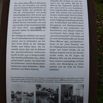 Gedenktafel von 2010, anlässlich des 20-jährigen Jubiläums der Gemeindepartnerschaft zwischen Deckenpfronn und der ostdeutschen Gemeinde Weißenberg in Sachsen. U-förmiger Edelstahlständer, darin eine rostende, rechteckige Metallplatte mit Durchbrechungen in Form eines Baums und einer Inschrift. 110cm hoch, 65cm breit und 1cm tief, gut erhalten. Auf einer separaten Metallplatte steht ein erläuternder Text zu Wiedervereinigung und Gemeindepartnerschaft.