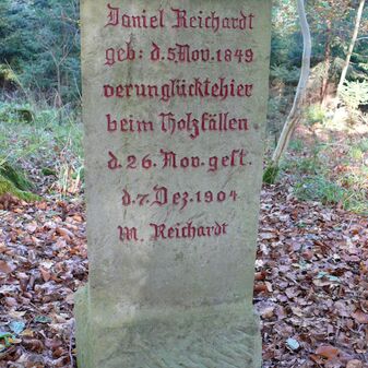 Daniel Reichardt / geb: d.5.Nov.1849 / verunglückte hier / beim Holzfällen / d.26.Nov.gest. / d.7.Dez. 1904 / M. Reichardt