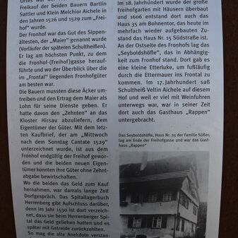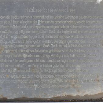 Heberbreiwedler / werden die Deckenpfronner genannt, seit neugrierige Gärtringer Bauern vor über 200 / Jahren sie auf ihren Wiesen in der Rohrauer Au gesehen haben, wo die Bauern unseres / Ortes Wiesen mähten und zum Vesper ihren mitgebrachten Haberbrei verzehren wollten, / den sie im Sutterkrug mitgenommen hatten. Doch der Brei war kalt und erst durch kräftiges / Hin- und Her-"wedeln" des Kruges über einem kleinen Feuer wurde der Haberbrei wieder / flüssig und konnte in Teller gefüllt werden. Die Gärtringer boten beim nächsten / Wiesengang den Deckenpfronnern zum Gruß: "So, kommet ihr Haberbreiwedler wieder!" [...]