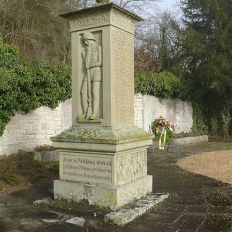 Gefallenendenkmal für die im Ersten Weltkrieg gefallenen Soldaten der Gemeinde; gefertigt 1922 von Matthias Kübler, Steinmetz aus Stuttgart. Stele auf Sockelpodest aus Sandstein, kapitellartiger Abschluss mit Kugel mit Verzierungen. Relief eines trauernden Soldaten, Kampfszene in Anlehnung an antike Reliefs, Inschriften mit den Namen und Lebensdaten der gefallenen Soldaten. 3,60m hoch, 1,30m breit und tief, geringe Beschädigungen.
