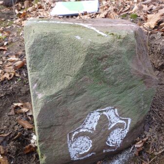 Gemarkungsgrenzstein auf aktuellem Grenzverlauf Gärtringen / Oberjesingen (zugleich Gemeindegrenze Gärtringen / Herrenberg); roter Sandstein, 50cm hoch, 18cm breit, 16cm tief, rechteckige Grundform, gerade stehend, gewölbter Kopf. Kennzeichnung an der Seite mit Kelch-Symbol.