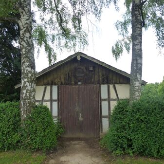 „Geschirr- und Beinerhäus‘chen“ von 1882 auf dem Friedhof an der nördlichen Friedhofsmauer, 2,40mhoher Fachwerkbau mit Satteldach und Holzverkleidung an den Giebelflächen. Dachfläche aus Bitumenpappe. Giebelkreuz nicht mehr erhalten. Türe vergrößert.