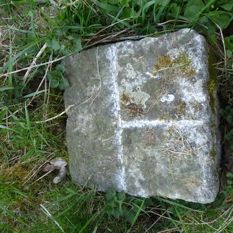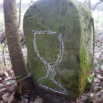 Gemarkungsgrenzstein auf aktuellem Grenzverlauf Gärtringen / Dachtel (zugleich Gemeindegrenze Gärtringen / Aidlingen); Sandstein, 38cm hoch, 22cm breit, 18cm tief, rechteckige Grundform, gerade stehend, flacher Kopf mit geradliniger Krinne, beschädigt. Kennzeichnung an der Seite mit Kelch-Symbol.