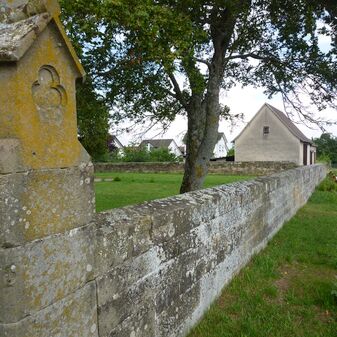 Friedhofsmauer: 1999 teilweise renovierte, 1mhohe Umfassungsmauer bestehend aus Sandsteinquadern und z. T. aus zweischaligem Mauerwerk. Sie umschloss den alten Teil des 1872/1873 angelegten Friedhofs. Östliches Tor mit verzierten Steinpfosten und schmiedeeisernen Torflügeln. Westseite nicht erhalten.