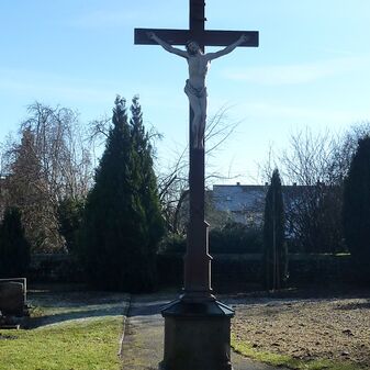 Im Herzen des alten Friedhofs steht das Friedhofskreuz aus Stein, bestehend aus einem Sockel und einem Kruzifix. Es weist heute geringe Schäden auf.