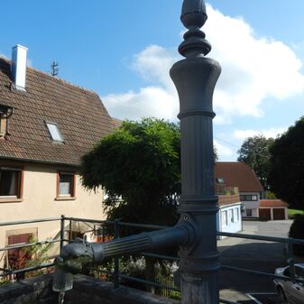 Dieser gut erhaltene Laufbrunnen aus Gusseisen besteht aus einem mit Ornamenten verzierten Brunnenstock, einem ebenfalls verzierten Ausgussrohr und einem runden kleinen Becken.