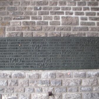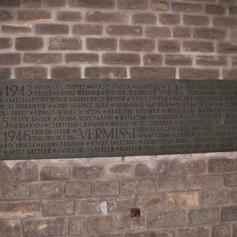 Das Gefallenendenkmal erinnert an die Verstorbenen und Vermissten der beiden Weltkriege. Zwei Bronzetafeln mit den Jahreszahlen und den Namen der Gefallenen sind dafür an den Wänden der ehemaligen Aussegnungshalle angebracht.