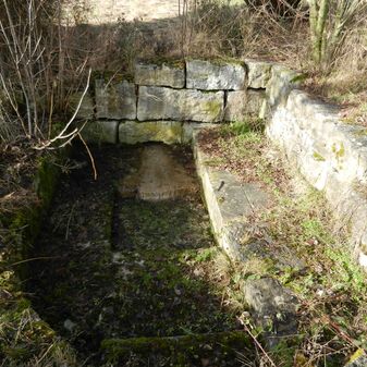 Dieser moderne Laufbrunnen entstand in den 1970er Jahren und besteht aus einem rechteckigen niedrigen Brunnenbecken aus Kalksteinquadern und einer Rückwand mit einer rechteckigen Öffnung, aus der das Wasser herausläuft.