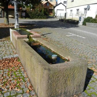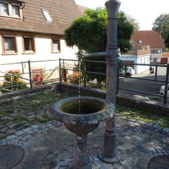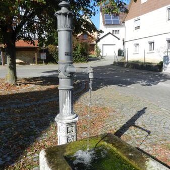 Bei diesem Laufbrunnen, erbaut 1985, fließt das Wasser von einem Sandsteintrog in einen anderen. Der Brunnenstock wurde aus Gusseisen gefertigt und mit Ornamenten verziert. Der Brunnen ist gut erhalten.