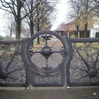 Dieses Tor aus Schmiedeeisen dient als Eingang zum erweiterten Friedhofsteil. Es wurde von Bildhauer Lutz Ackermann in den 1990er Jahren geschaffen und besteht aus drei Elementen, in der Mitte ein Kreis mit Kreuz und an den Seiten jeweils ein Stern mit kleinen Kreisen.