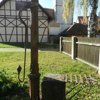 Dieser Pumpbrunnen gehört zum Pfarrgarten der alten evangelischen Kirche. Er besteht aus Gusseisen und einem mit Ornamenten verzierten Brunnenstock, einem gebogenen Hebel und einem Steinquader mit Metallgitter, auf denen ein Gefäß zum Auffangen des Wassers abgestellt werden kann. Der Brunnen weist geringe Schäden auf und ist nicht in Betrieb.