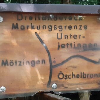Dieses hölzerne Schild weist auf den Verlauf der drei Gemarkungsgrenzen Mötzingen, Unterjettingen und Öschelbronn hin, die sich hier treffen.