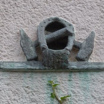 Dieses Bauornament wurde ca. 1910 über der heute zugemauerten Eingangstür einer ehemaligen Schmiede angebracht und besteht aus einem Hufeisen sowie zwei Hämmern.