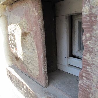 Der Steinschieber diente zur Belüftung des Kellers. Die Sandsteinplatte ist mit einer Rosette und Griffmulden versehen. Er ist 55cm hoch, 70cm breit und ist sehr gut erhalten.