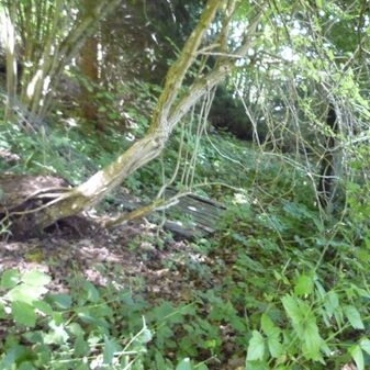 Dieses Sühnekreuz stammt vermutlich aus der Zeit vor 1600 und ist in einer Stützmauer eingemauert. Auf dem Sandsteinkreuz ist eine Pflugschar abgebildet. Es weist geringe Schäden auf und ist 70cm hoch sowie 57cm breit.