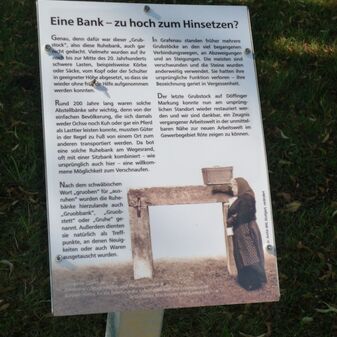 Die Ruhebank besteht aus zwei waagrechten unterschiedlich hohen Sandsteinblöcken. Seit 2009 befindet sich daneben eine Metalltafel mit Informationen. Die Bank stammt vermutlich aus der ersten Hälfte des 19. Jahrhunderts und wurde 2010 sowie 2011 renoviert. Sie ist 131cm hoch, 189cm breit und 42,5cm tief.