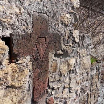 Dieses Sühnekreuz stammt vermutlich aus der Zeit vor 1600 und ist in einer Stützmauer eingemauert. Auf dem Sandsteinkreuz ist ein Winkeleisen abgebildet. Es weist Schäden auf und ist 60cm hoch sowie 62cm breit.