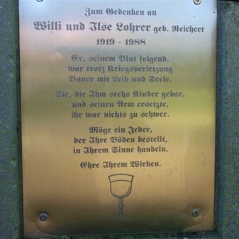 Zum Gedenken an / Willi und Ilse Lohrer geb. Reichert / 1919-1988 / Er, seinem Blut folgend, / war trotz Kriegsverletzung / Bauer mit Leib und Seele. / Sie, die Ihm sechs Kinder gebar, / und seinen Arm ersetzte, / ihr war nichts zu schwer. / Möge ein Jeder, / der Ihre Böden bestellt, in Ihrem Sinne handeln. / Ehre Ihrem Wirken.