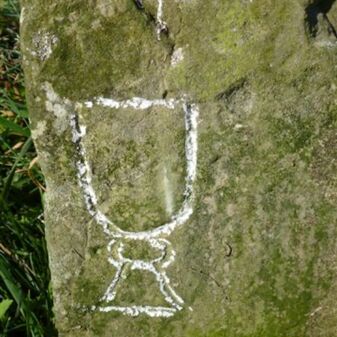 Grenzstein der Gemarkung Unterjettingen und Haslach (zugleich Gemeindegrenze Herrenberg und Jettingen), mit Symbol (Kelch) und abgewinkelter Krinne. Rechteckige Grundform, flacher Kopf, befriedigend erhalten, Sandstein, 35cm hoch, 23cm breit, 21cm tief.