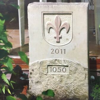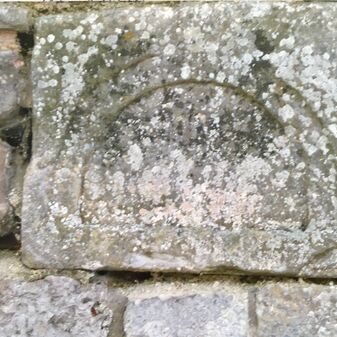 Weihwasserbecken aus Stein aus dem Jahr 1481. Es weist eine Vertiefung für das Wasser auf und ist in die Fassade eingelassen. Befriedigend erhalten.