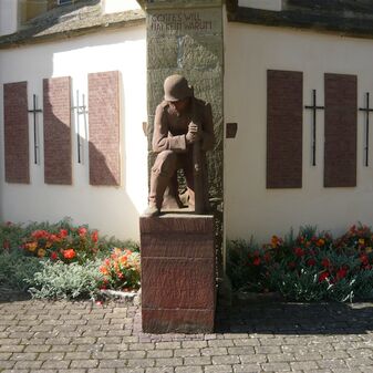 Gefallenendenkmal an der Fassade der Stephanuskirche zum Gedenken an die Gefallenen und Vermissten des Zweiten Weltkriegs. Es stellt einen trauernden Soldaten aus Sandstein auf einem Sockel dar. Auf dem Sockel und über dem Kopf des Soldaten befindet sich eine Inschrift. Entlang der Fassade aufgereiht befinden sich Sandsteinplatten mit den Namen und Daten der Vermissten und Gefallenen, dazwischen metallene Kreuze. Sehr gut erhalten.