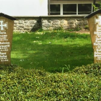 Gräber mit hölzernen Tafeln, worauf sich die Namen und Daten der im Zweiten Weltkrieg Verstorbenen befinden. Sehr gut erhalten.