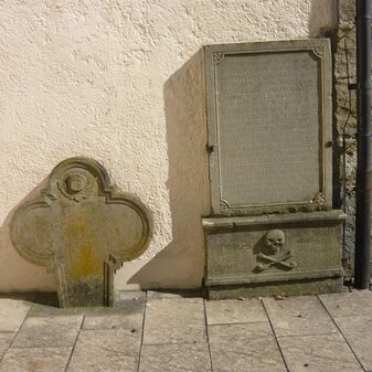 Zwei Epitaphe aus Stein, eines in Dreipassform mit Inschrift und Engel, das andere in rechteckiger Form mit Inschrift und Totenkopf. Gut erhalten.