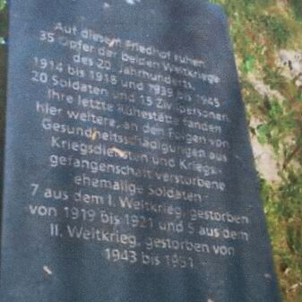 Auf diesem Friedhof ruhen / 35 Opfer der beiden Weltkriege / des 20. Jahrhunderts, / 1914 bis 1918 und 1939 bis 1945 / 20 Soldaten und 15 Zivilpersonen / Ihre letzte Ruhestätte fanden / hier weitere, an den Folgen von / Gesundheitsschädigungen aus / Kriegsdiensten und Kriegs- / gefangenschaft verstorbene / ehemalige Soldaten / 7 aus dem 1. Weltkrieg gestorben / von 1919 bis 1921 und 5 aus dem / II. Weltkrieg, gestorben von / 1943 bis 1951 // …