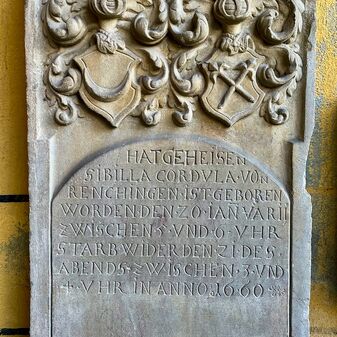 Dieser Grabstein von 1660 ist Sibilla von Renchingen, einem Kind der adligen Familie von Renchingen (Remchingen), gewidmet. Ihr Vater, Ulrich von Remchingen, war Amtmann (Vogt) in Holzgerlingen. Der Grabstein ist 80cm hoch, 44cm breit, 12cm tief und sehr gut erhalten.